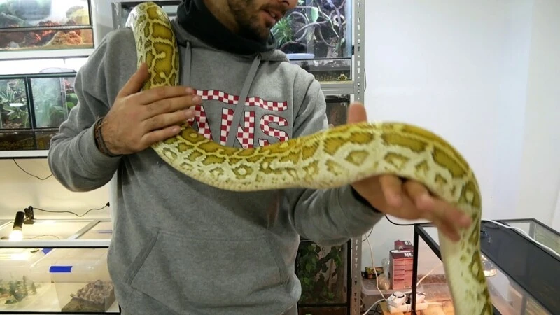 - Тигровых питонов содержать их не сложно. Необходимые условия – просторный террариум, неглубокий большой бассейн с теплой водой и толстые ветки для лазания. Так как эти животные – обитатель тропиков, температура и влажность должны быть высокими (26-32°С и 70-80% соответственно). Обычно эти змеи хорошо приручаются и не вызывают сложностей при уходе за ними. Взрослому питону достаточно одного кролика раз в две недели.