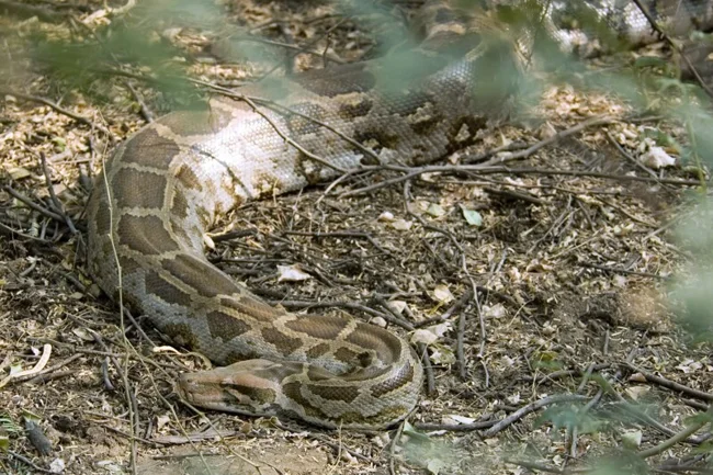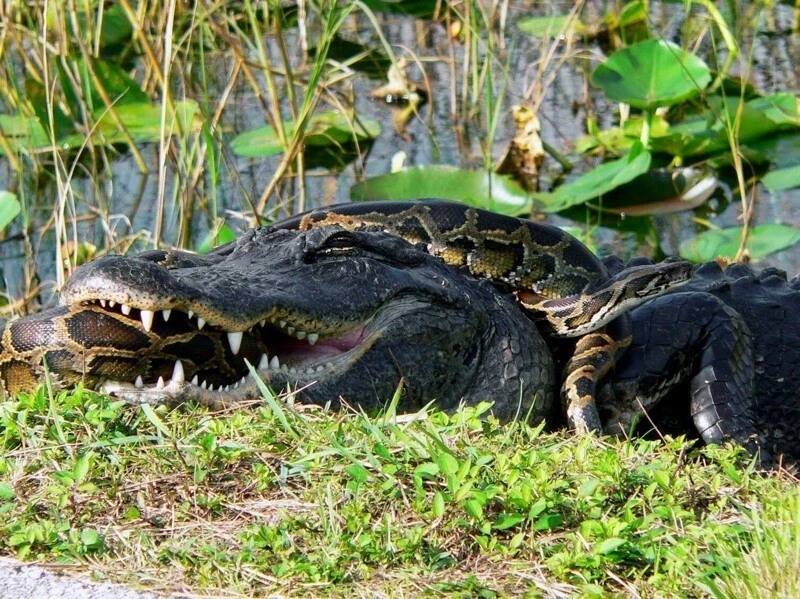 - В национальном парке Эверглейдс штат Флорида , были незаконно выпущены тигровые питоны, и с 1979 года они смогли поселиться и там. С 2001 года произошло значительное увеличение популяции; в 2007 году количество змей уже оценивалось в 30 500 особей. Змеи считаются угрозой для местных животных, например, для рыси, сумчатых, каролинских поганок, белохвостого оленя и койота. Также охотятся на миссисипских аллигаторов малого и среднего размера. Так, внутри мертвой змеи длиной 3,86 метра был обнаружен двухметровый аллигатор. С другой стороны, более мелкие питоны также поедаются аллигаторами.