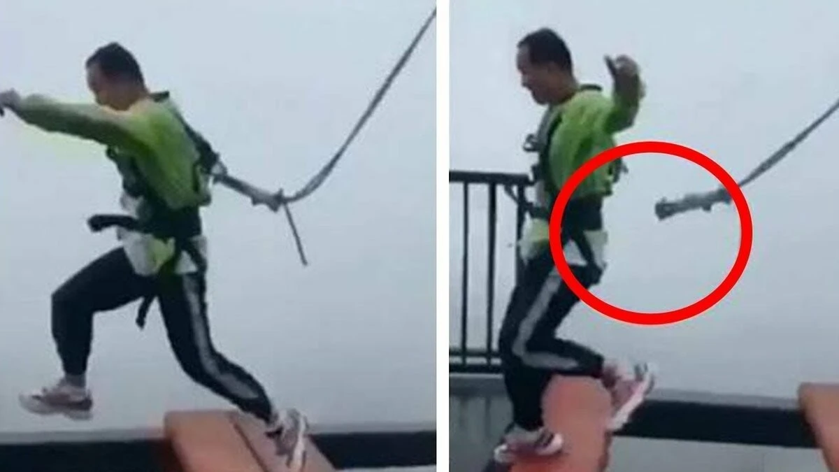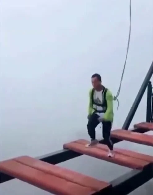 Вы решитесь на этот страшный прыжок веры? Этот страшный аттракцион в одном из тематических парков Китая оказался в центре скандала, когда оказалось, что страховочные ремни были несправны. Это последнее, что вы хотите узнать, когда прыгаете в пропасть глубиной 150 м. Этот страшный момент, снятый на аттракционе в Чунцине, был снят на камеру. На нем мы видим несколько секунд, от которых сердце любого человека остановиться от страха. Вот крюк на ремнях отстегивается. И мужчина ничем не защищен. Этот аттракцион называется «Экстремальный прыжок», он заключается в том, что над утесом на раме располагаются шесть досок. Расстояние между ним- 1,5 м. Чтобы сделать этот пугающий аттракцион боле зрелищным, под досками не устанавливают страховочную сеть. Не знаю как у вас, у меня сердце уходит в пятки при мысли, чем могло закончиться это происшествие.