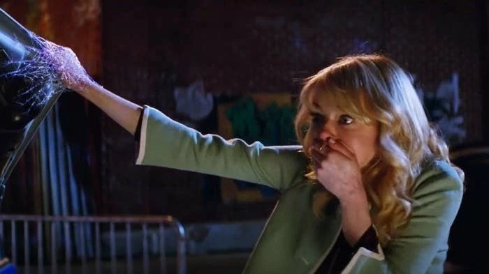 Согласно сценарию, Питер действительно должен был приклеить руку Гвен паутиной к полицейской машине, но в сценарии не было ее возмущенного крика «Питер!», который очевидно выдал бы настоящую личность Человека-паука. Но сам этот крик и реакция Эммы Стоун на собственную ошибку получились слишком очаровательными, чтобы их вырезать.