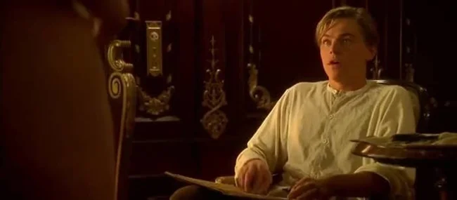 В сцене, когда Джек готовится нарисовать Роуз как одну из своих француженок, Леонардо ДиКаприо запутался в словах: вместо «Приляг на диван» он сначала сказал «на кровать» и тут же исправился. Оговорка придала шарма очевидно смущенному Джеку, поэтому Джеймс Кэмерон оставил этот дубль в фильме.