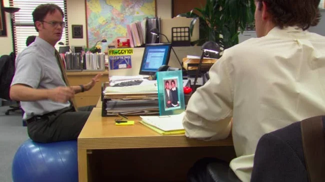 Сцена, в которой Джим лопает Дуайтовский мяч для фитнеса, — одна из самых легендарных в сериале, но произошло это случайно: Джон Красински и Рэйн Уилсон думали, что мяч просто тихонько сдуется, а не лопнет. Они отрепетировали сцену трижды, а затем сняли 13 дублей, и мяч каждый раз медленно сдувался, как и планировалось. На 14-й раз мяч внезапно лопнул — обратите внимание, как Джон выходит из кадра, чтобы отсмеяться, — и этот дубль оставили в итоговой версии.