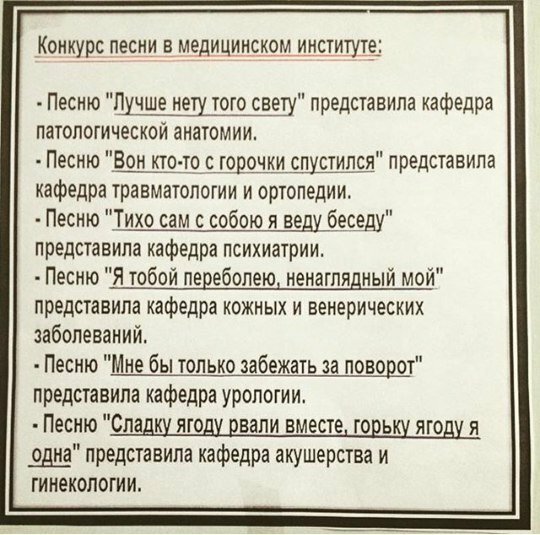Врачи шутят (18 фото) 1 апреля 2020 0 Категория: смешное Пестрая подборка медицинского юмора. Поделитесь новостью с друзьями: Facebook Twitter Pinterest +1