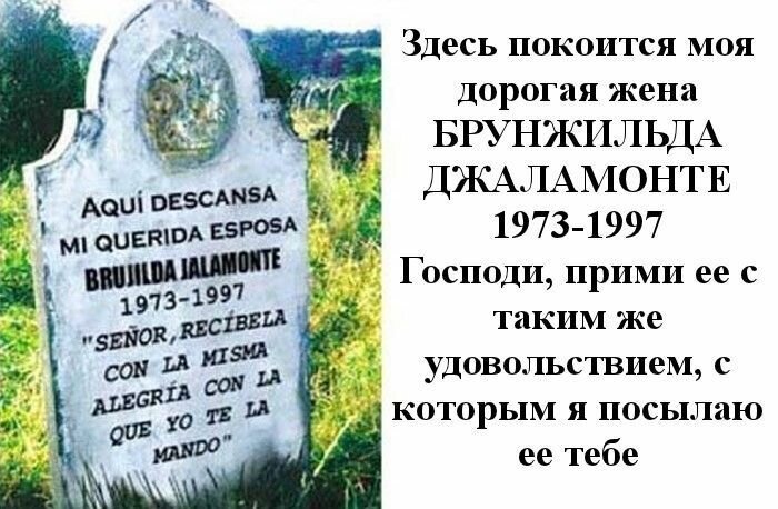 Смешные эпитафии (4 фото) 2 мая 2020 0 Категория: смешное Забавные эпитафии написанные на могилах. Поделитесь новостью с друзьями: Facebook Twitter Pinterest +2