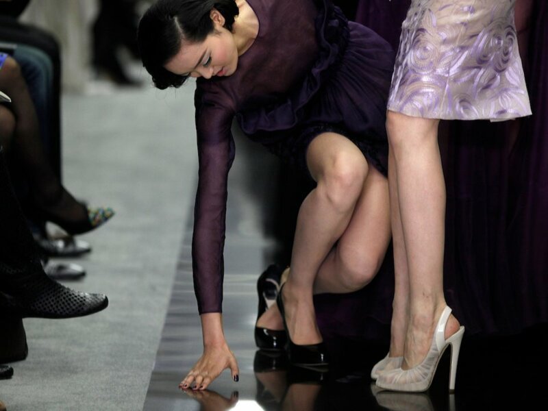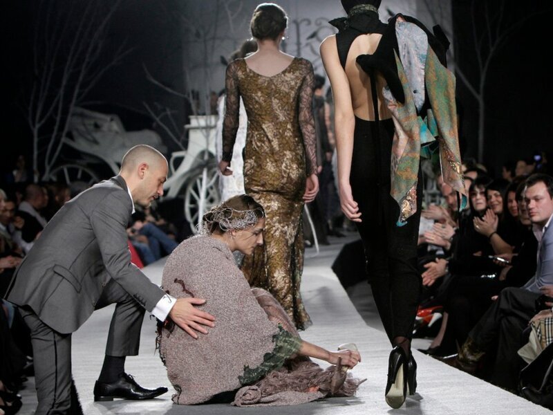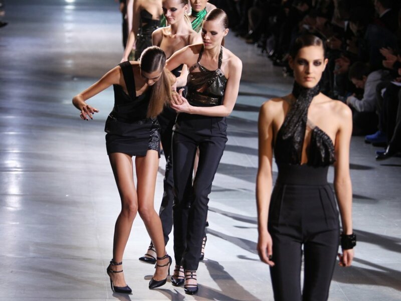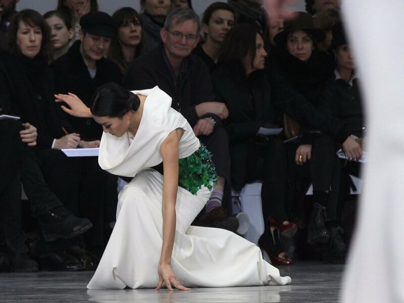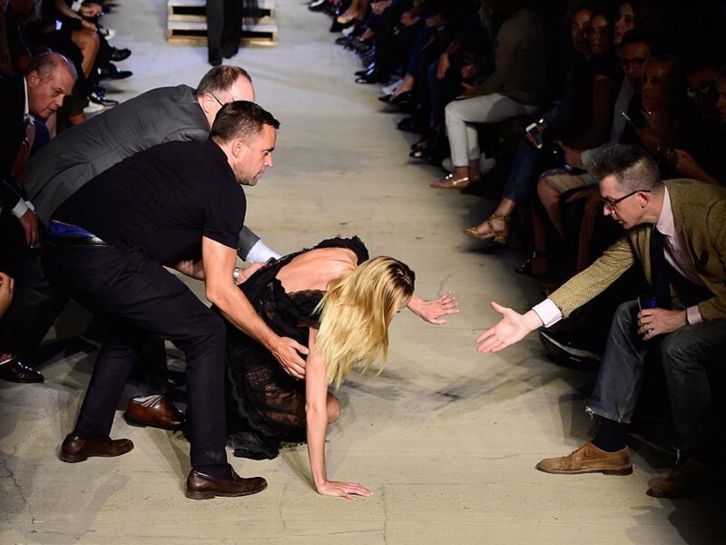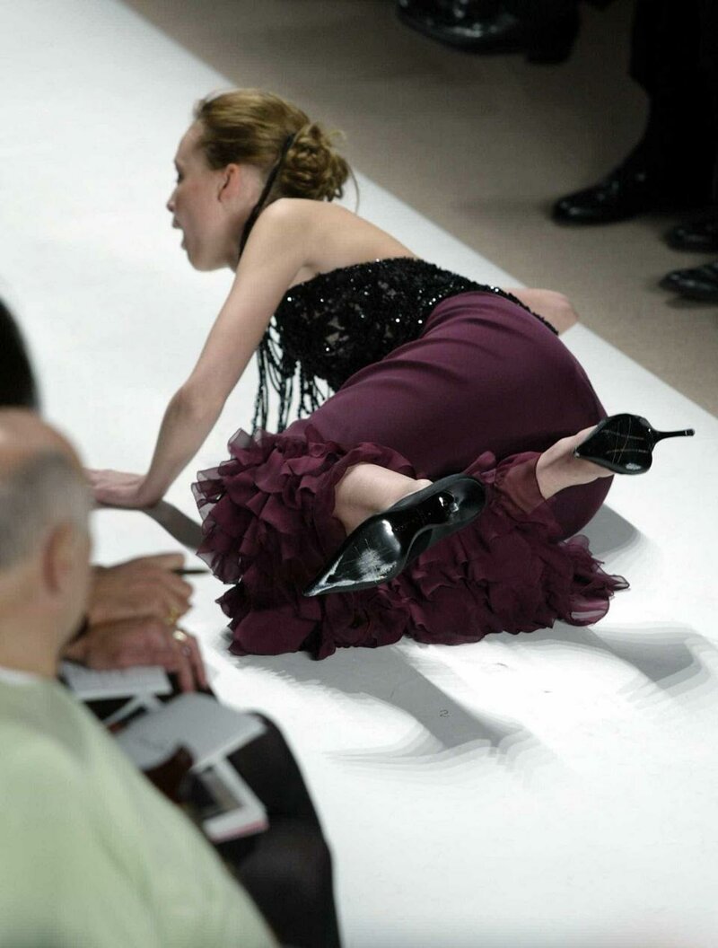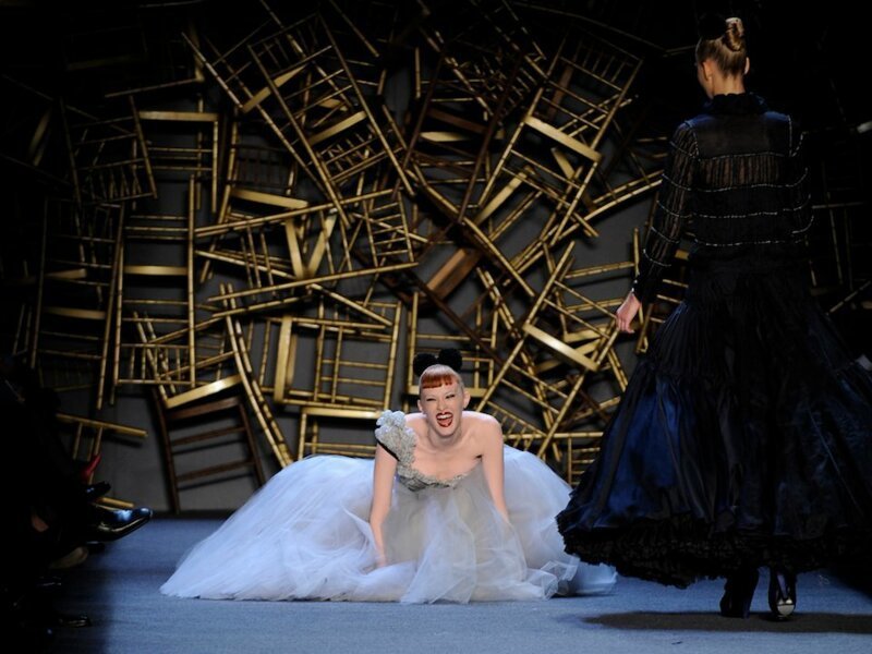 Фантазии модельеров нет предела, а потому они одевают девушек в экстравагантные наряды, в которых не то что ходить - стоять сложно. Потому неудивительно, что с завидной частотой модели исполняют на подиуме пируэты, схожие с акробатическими номерами в цирке.