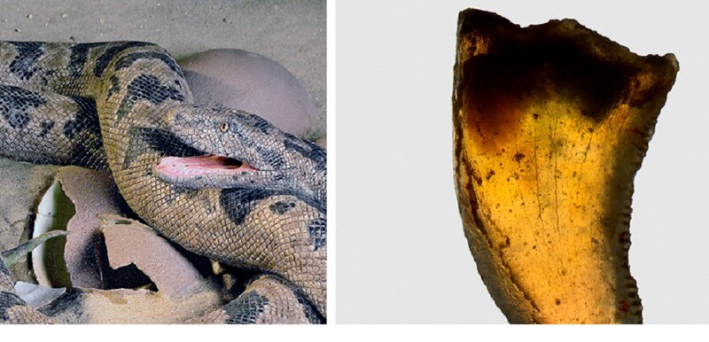Этим останкам 68 миллионов лет. Древняя гигантская змея обвилась вокруг скорлупы яйца, изкоторого только что вылупился детеныш динозавра, и готова его съесть. Ее трапезе помешал обвал, который засыпал и ее, и динозавра. Драматическая сцена, в виде окаменевших останков обнаруженная в Западной Индии, была восстановлена палеонтологами. Верхнее фото - останки, нижнее - реконструкция.