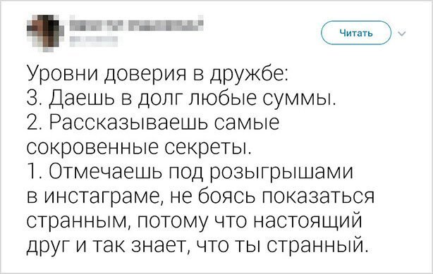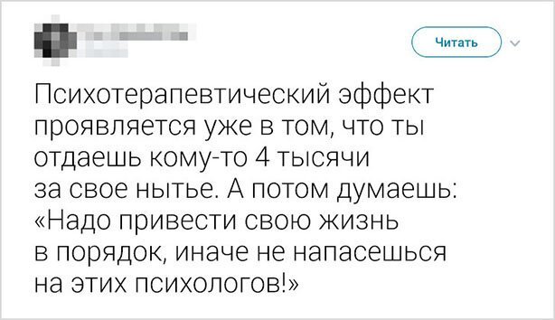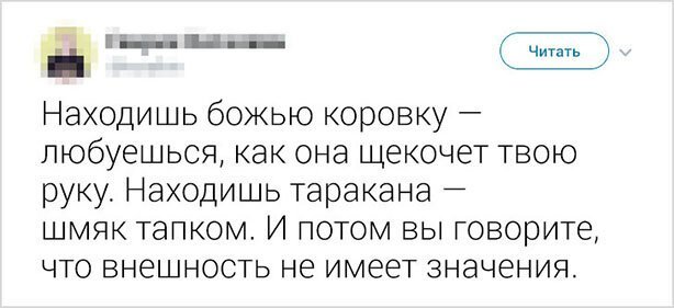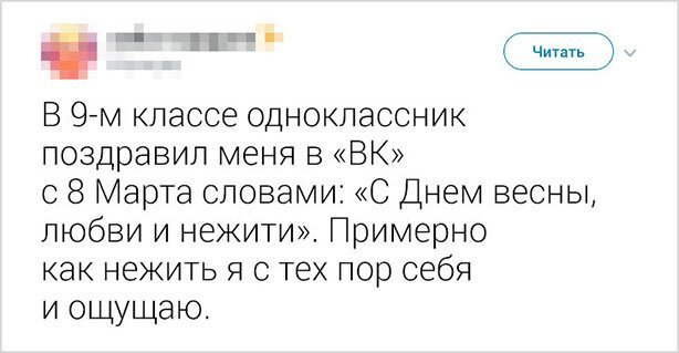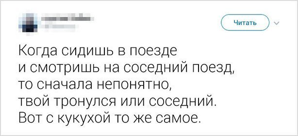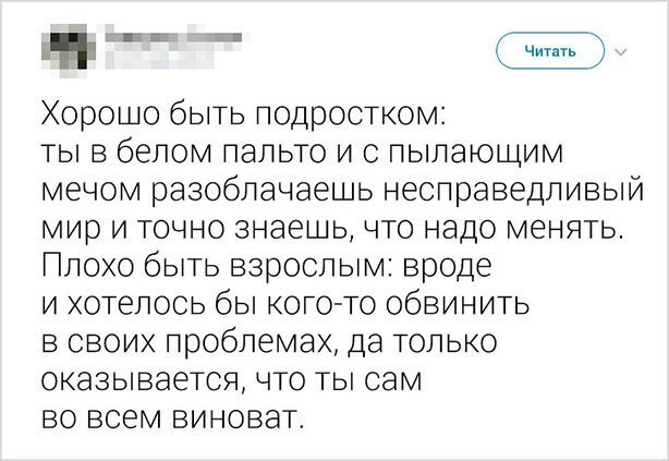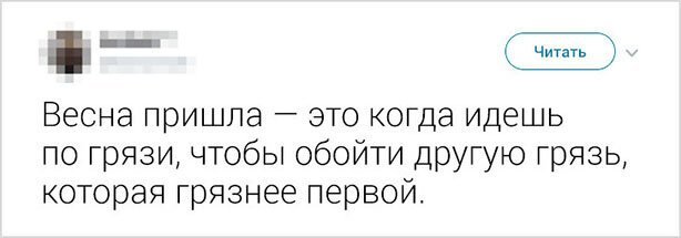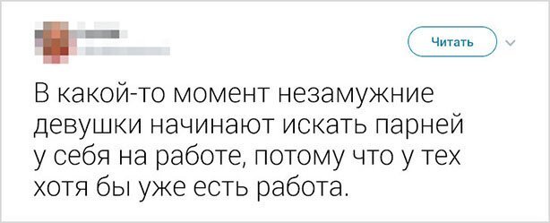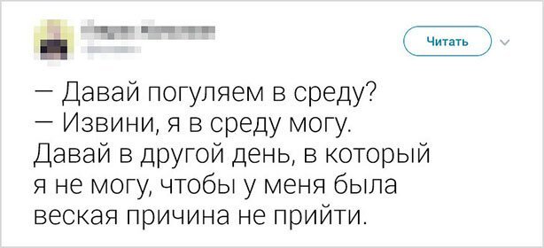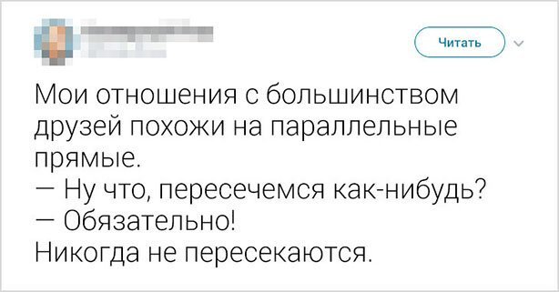Подборка ироничных твитов (20 фото) 8 октября 2021 0 Категория: надписи на картинках Подборку твитов от пользователей, которые знают толк в циничных и хлестких шутках, которые красноречиво описывают жизнь такой, какая она есть. Наверняка, в некоторых из этих твитов вы узнаете себя или ваших знакомых. Поделитесь новостью с друзьями: Facebook Twitter Pinterest 0