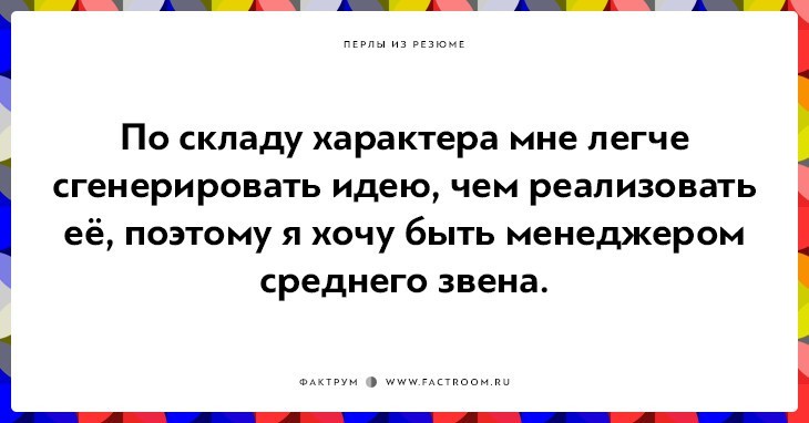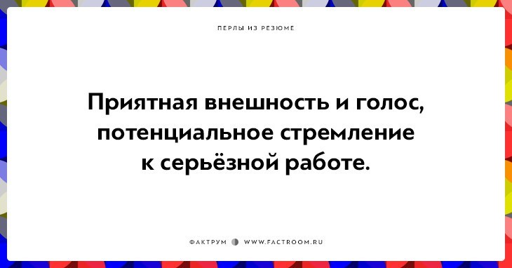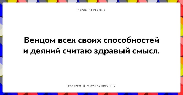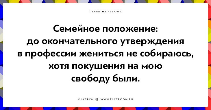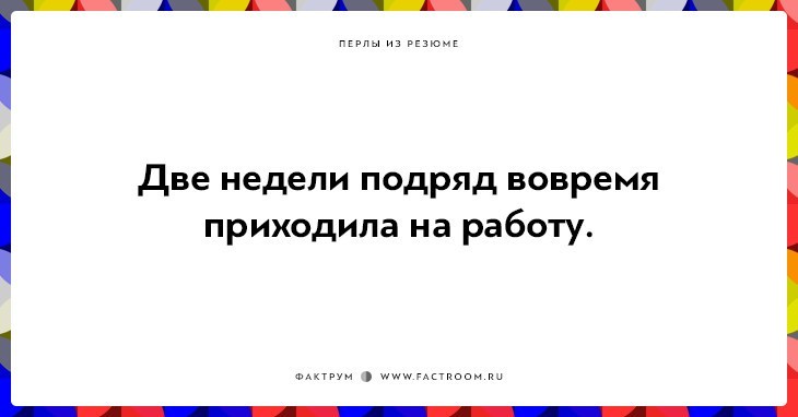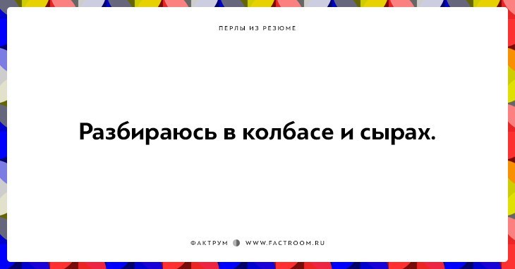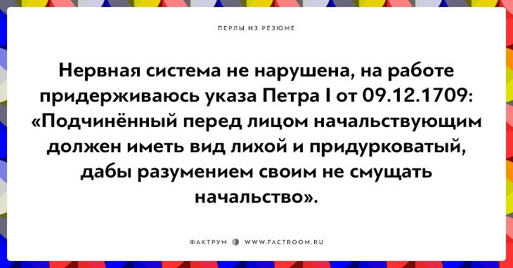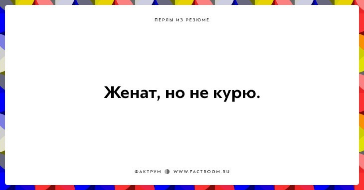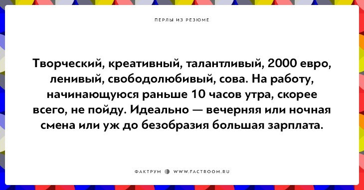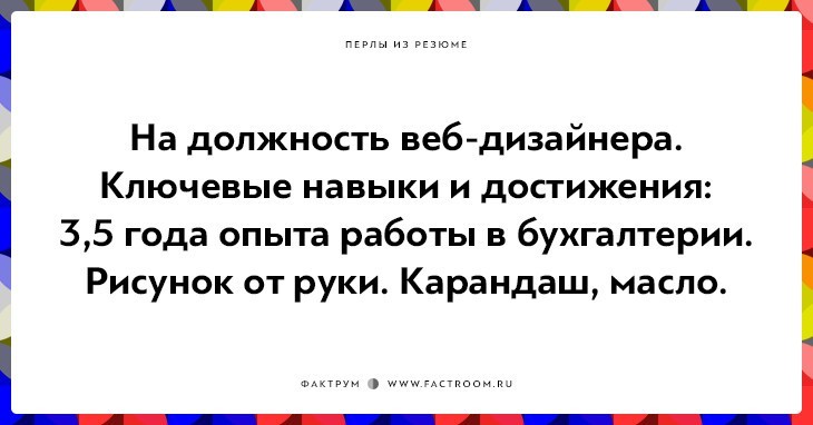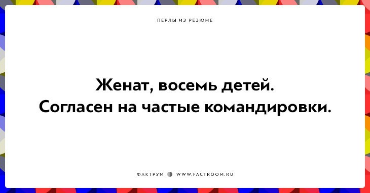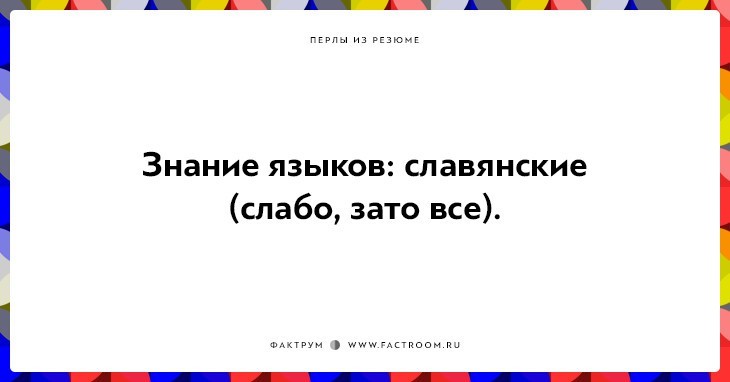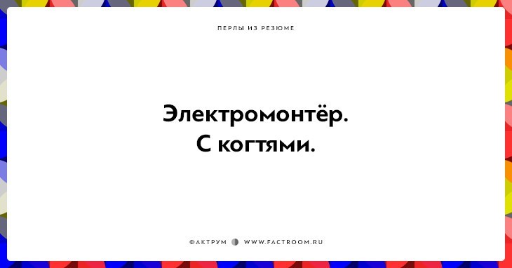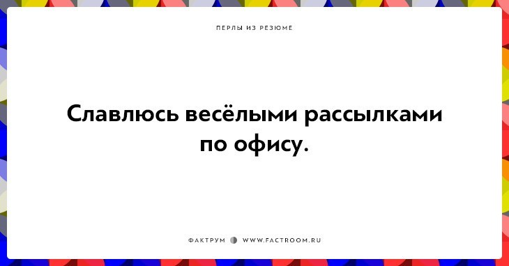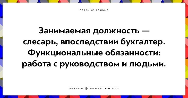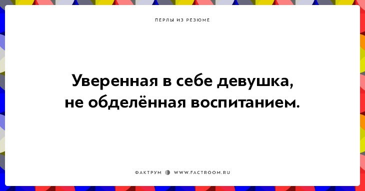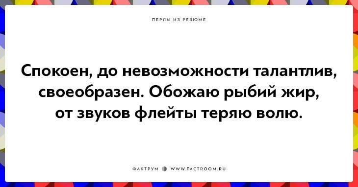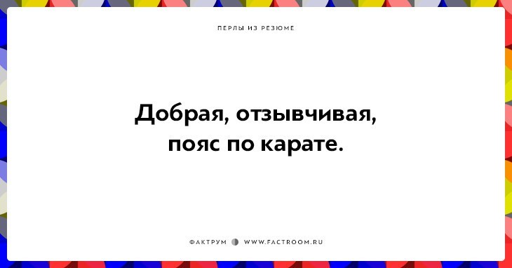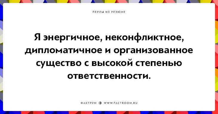 20 незабываемых перлов из резюме оригинальных людей (22 фото) 16 октября 2021 0 Категория: смешное Порой на стол специалистов по подбору персонала ложатся такие шедевры, что просто невозможно не расхохотаться! Видно, что авторы старались показать себя во всей красе и мыслить нестандартно. Публикуем два десятка таких оригинальных перлов. Поделитесь новостью с друзьями: Facebook Twitter Pinterest 0