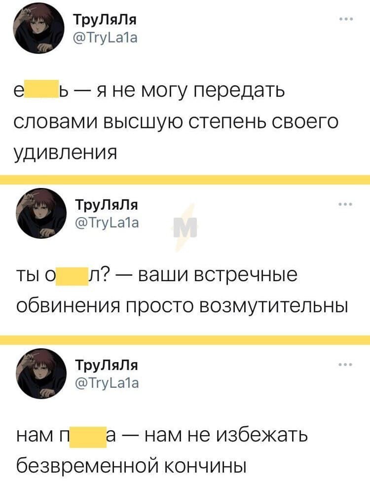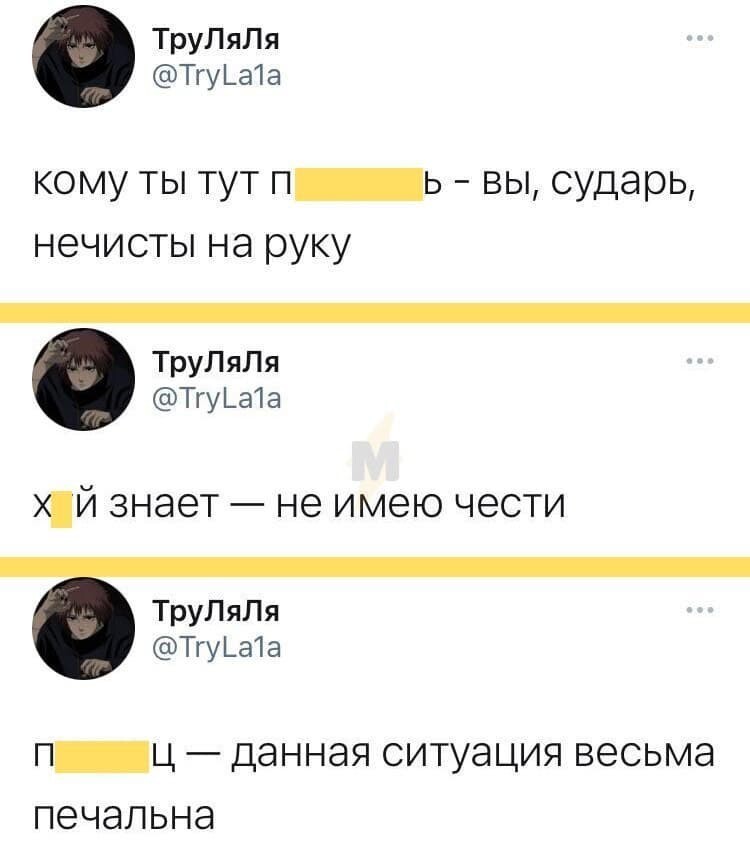 Учимся выражаться культурно (5 фото) 26 октября 2021 0 Категория: смешное К закону «Об информации», обязующие социальные сети удалять сообщения с нецензурной бранью. Держите актуальный тред, который окажет благотворное влияние на ваш словарный запас. Поделитесь новостью с друзьями: Facebook Twitter Pinterest +1