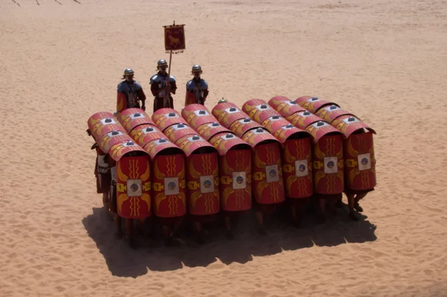 According to the ancient Roman writer Dio Cassius, the formation easily supported a chariot with a driver and made the fighters practically invulnerable at a distance.