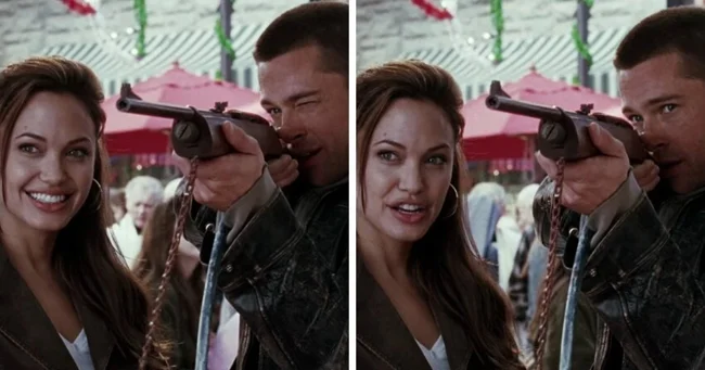 4. In the movie "Mr. and Mrs. Smith," Pitt's character takes aim, squinting his right eye, and opens it before shooting. That's what snipers do