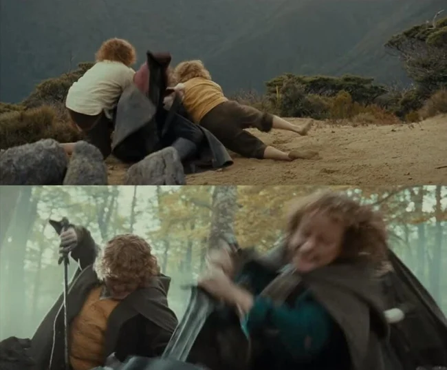 12. In The Lord of the Rings, the hobbits Pippin and Merry knock Boromir to the ground when he teaches them to fight. Later, the hobbits would kill the Uruk-hai in the same way.