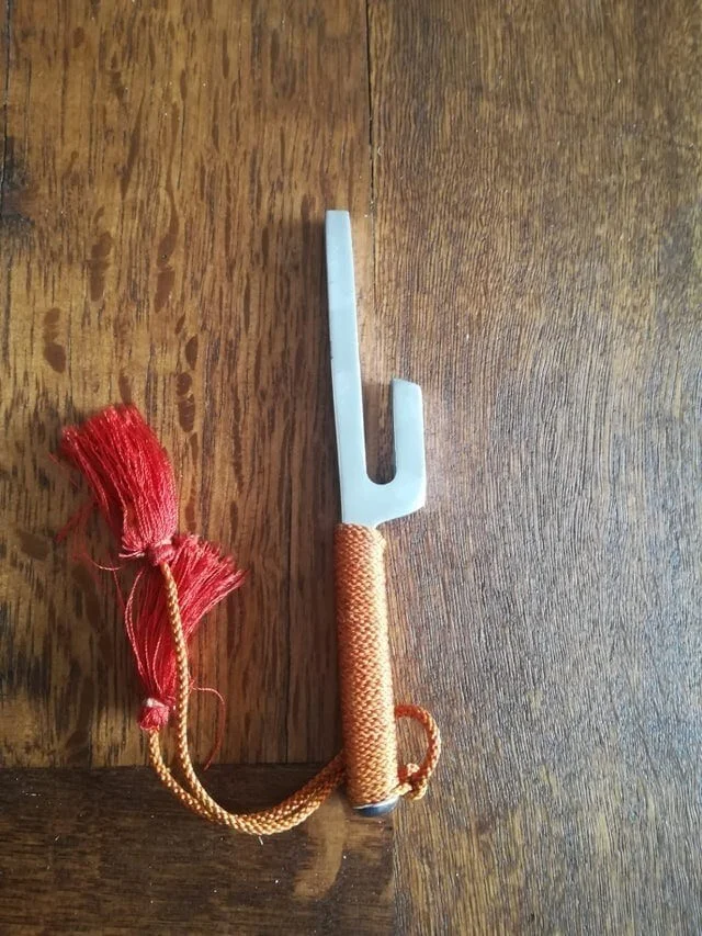 In the comments they also found out that it is stylized as a Japanese jutte weapon.