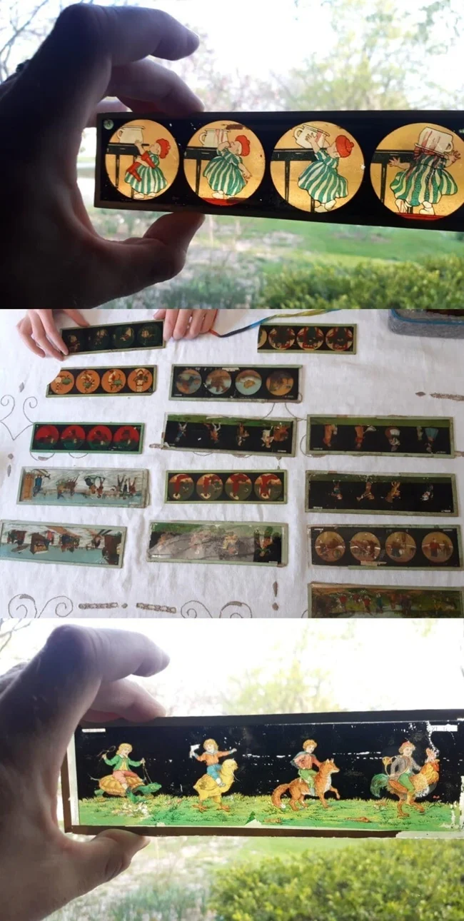 Slides for the "magic lantern". These should be inserted into the slide show projector.
