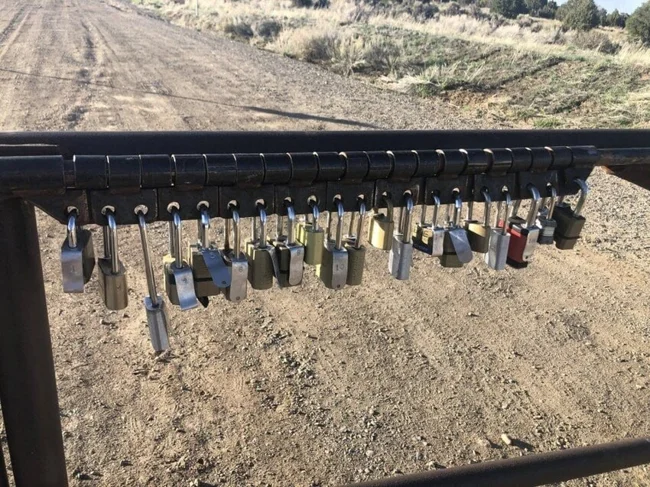 This is a gate blocking access to some cell towers. Why are there so many locks and how do you even open them?