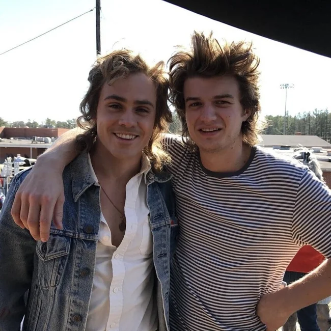 Dacre Montgomery and Joe Keery on the set of the second season of Stranger Things (2016-...).