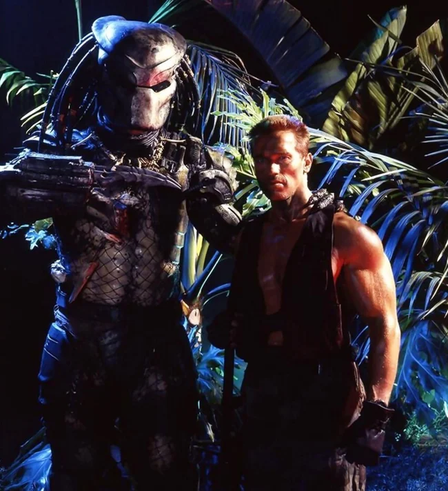 Kevin Peter Hall in full alien gear and Arnold Schwarzenegger on the set of Predator (1987).