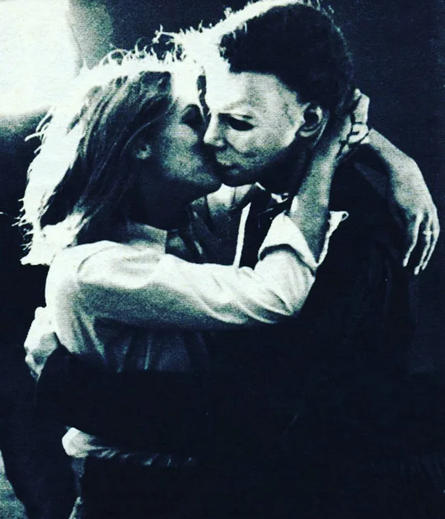 Jamie Lee Curtis and Nick Castle on the set of Halloween (1978).