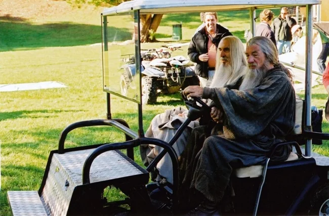 Ian McKellen and Christopher Lee on the set of The Lord of the Rings: The Two Towers (2002).
