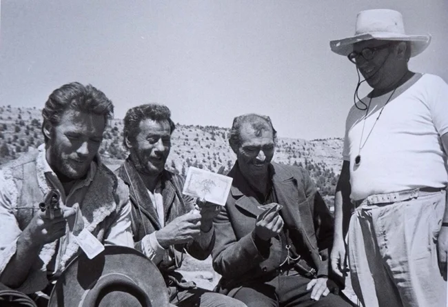 Clint Eastwood, Eli Wallach, Lee Van Cleef and director Sergio Leone on the set of The Good, the Bad and the Ugly (1966).