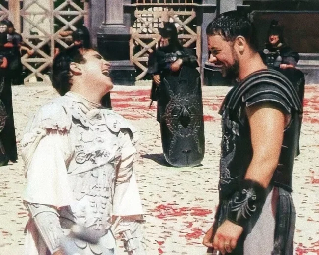 Joaquin Phoenix and Russell Crowe on the set of Gladiator (2000).