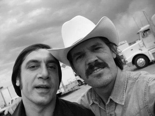 Josh Brolin and Javier Bardem on the set of No Country for Old Men (2007).