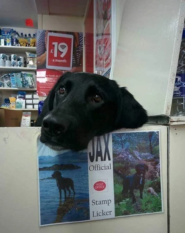 This is Jax, and he has no problem sticking any stamp on an envelope or card for you.