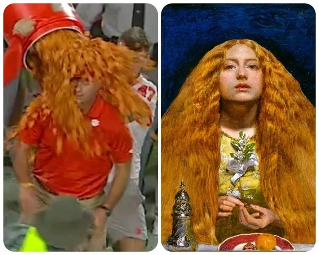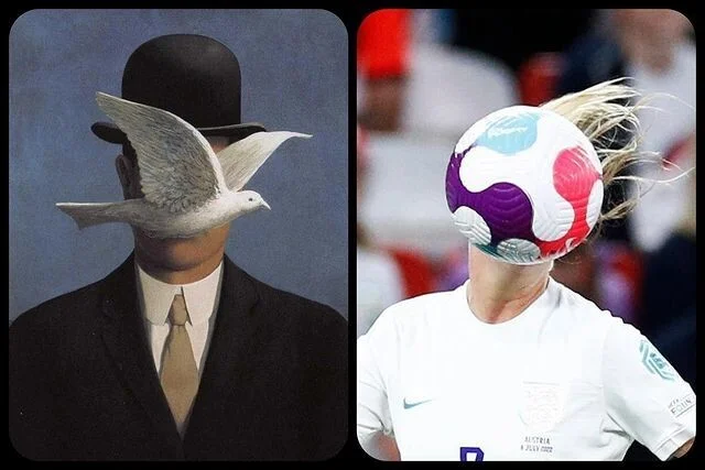 An amazing comparison of the moment of the game with the famous painting “The Man in the Bowler Hat”, Rene Magritte, 1964.