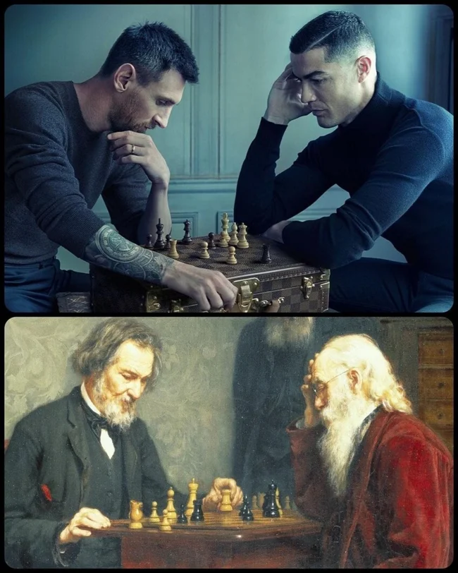 “Veterans”, Richard Kreyfelds, 1886 - with this picture the author compared the chess game of two famous football players, Ronaldo and Messi. The sensational photograph of football players for the Louis Vuitton advertising campaign was taken by photographer Annie Leibovitz and was called “Winning is a State of Mind.”