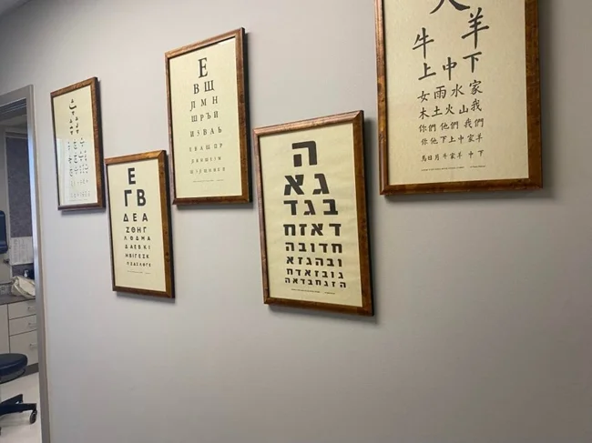 The ophthalmologist is prepared to test your vision in 5 languages at once.