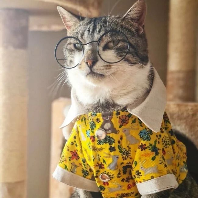 Stylish glasses and a corduroy shirt with a bright print - this cat is the most fashionable this fall