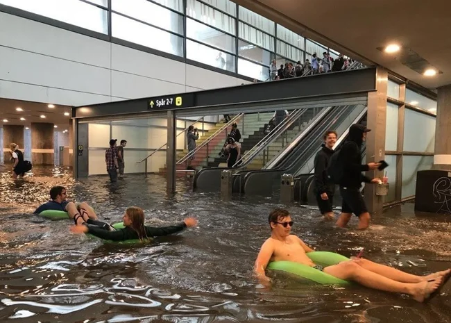 A train station in Sweden was flooded after a strong storm. Its appearance was provoked by a sharp rise in temperatures throughout Europe. Local residents were not at a loss and turned the space filled with water into a real swimming pool. They armed themselves with inflatable boats, diving masks, water pistols and had a great free time.