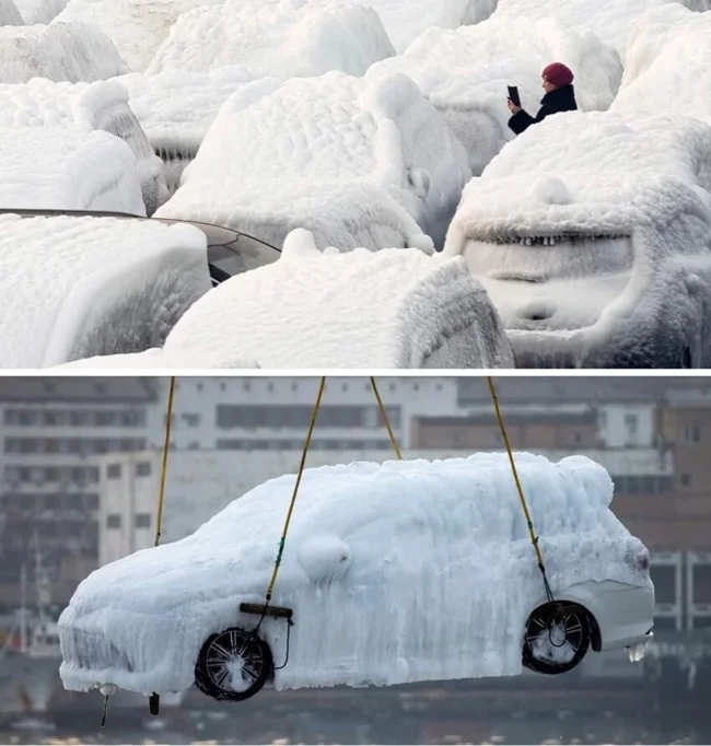 Photos show recently unloaded new vehicles covered in ice after the ship carrying them encountered the harsh climate of the Sea of Japan.