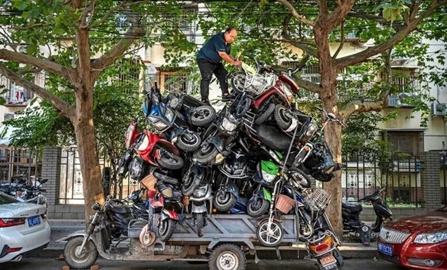 A man stacks recycled e-bikes and scooters on his electric tricycle for recycling, Beijing ![]()