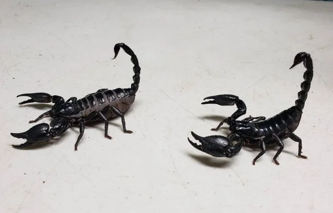 You can compare two Scorpios side by side and unmistakably tell which of them is in position. This female has a very large belly, which presumably contains about 20 future scorpions. During the first two weeks, they crawl onto their mother's back, where they are completely safe.