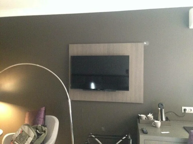 The hotel worker who installed the TV apparently had difficulty finding a level center and decided to simply hang it on the edge.