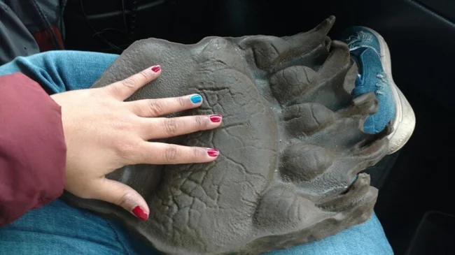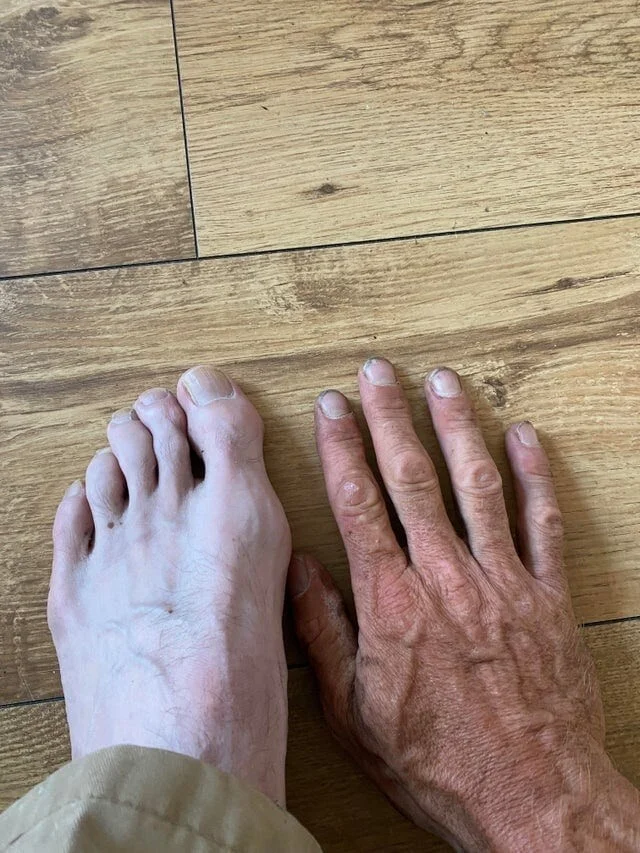 The guy is 213 cm tall, and he wears size 19 (US) shoes, and his wife wears size 9.