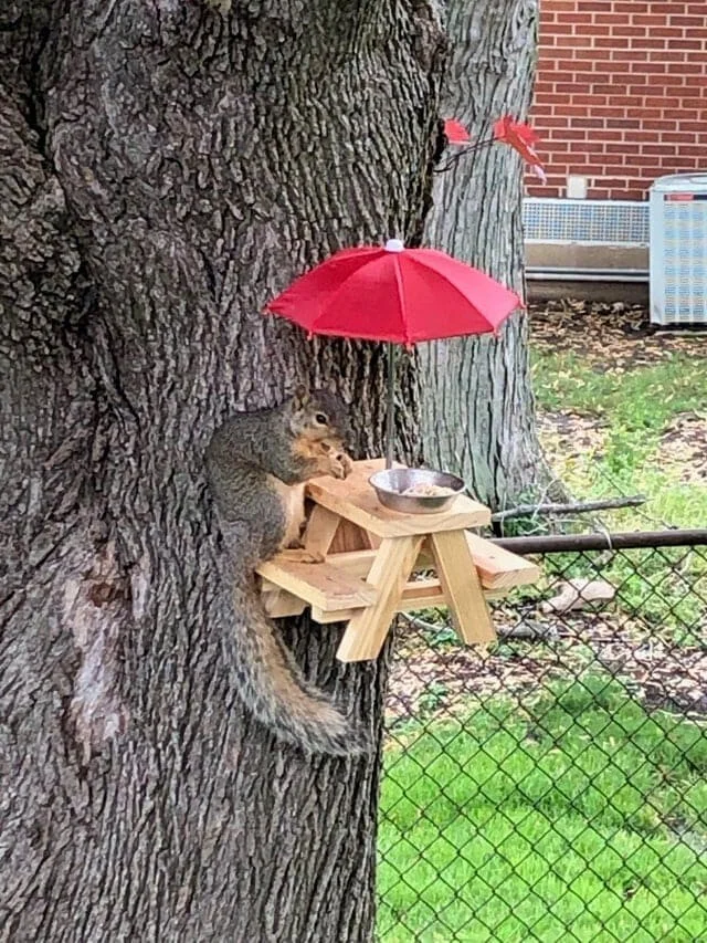 My mom loves feeding squirrels! I made a full-fledged mini picnic table from sausage boards.