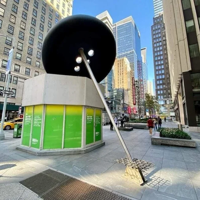 A giant needle and button representing the Manhattan Arts District
