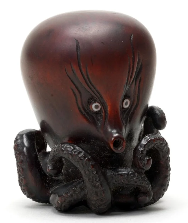 Carving of a tanuki wearing a lotus leaf hat and cloak. Japan, 19th century