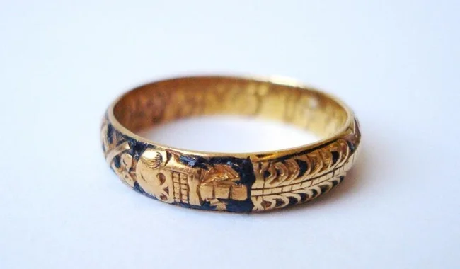 Gold mourning ring with the inscription "May love endure till death do us part", England, 1600s