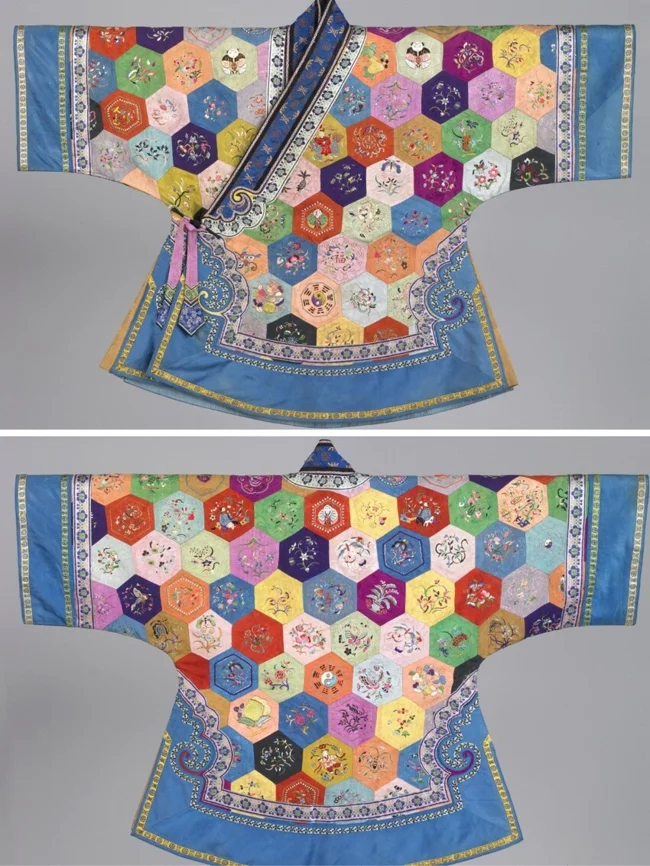 A boy's robe made from hexagonal silk scraps. China, Qin dynasty, late 19th century