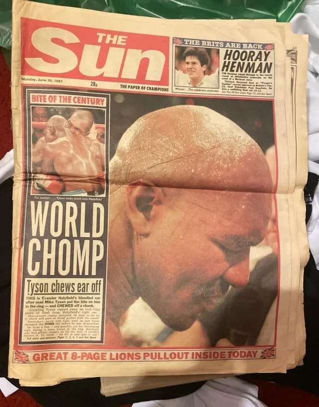 It tells how Mike Tyson bit off a piece of Evander Holyfield's ear.