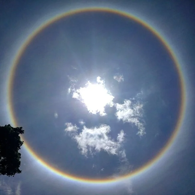 This is a 22 degree halo. A halo is an optical phenomenon where a ring of light forms around the sun or moon.