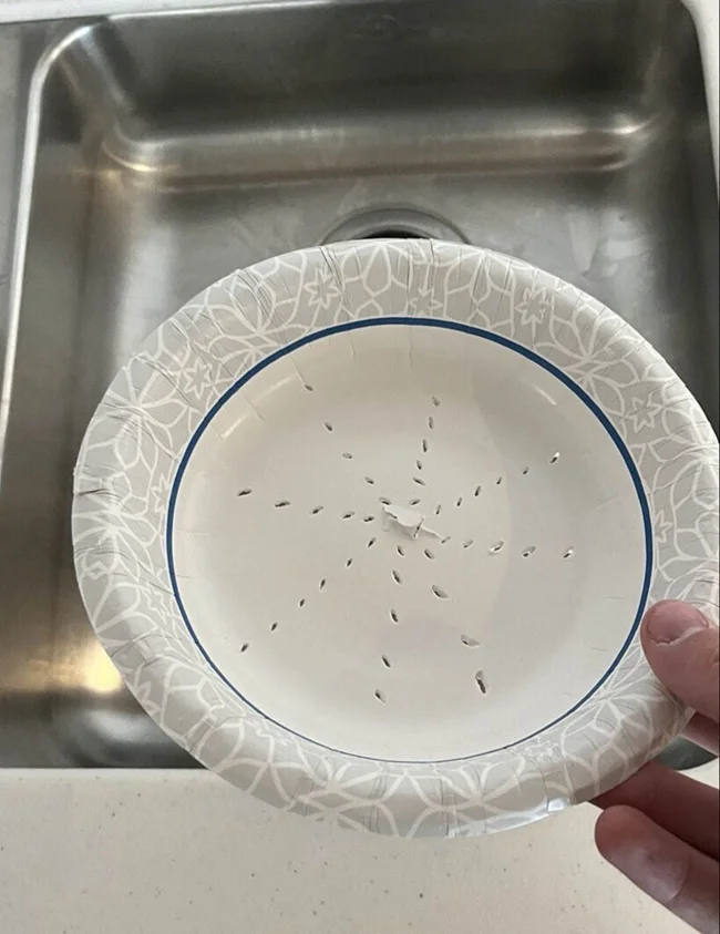 The man, lacking a colander, figured out how to make one from a cardboard plate