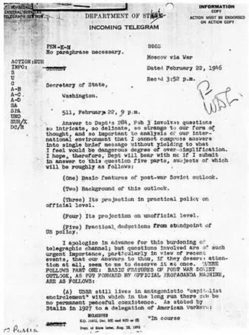 On February 22, 1946, an employee of the US Embassy in the USSR, George Kennan, sent a telegram in which he substantiated the impossibility of cooperation with the USSR. This telegram marked the beginning of a long period in the history of the two countries known as the Cold War from 1946 to 1991. You can read the full text of the telegram at the link.