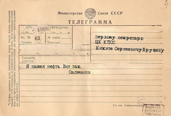 “Dear comrade, in Megion, at well No. 1, a gush of oil was obtained from a depth of 2180 meters. Clear? Sincerely, Farman Salmanov"