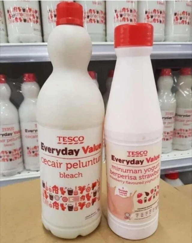 The first bottle contains cleaning product and the second bottle contains yogurt. Moreover, both products are produced under the TESCO retail chain brand, and their bottles are very similar.