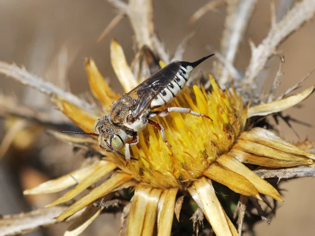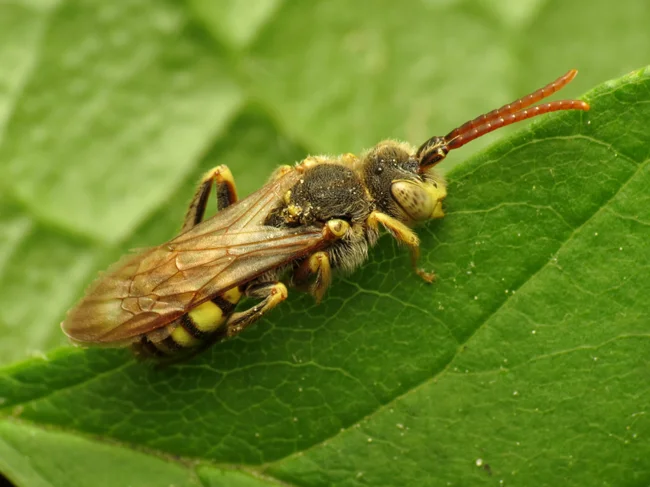 The female nomad bee lays eggs in the open nests of foraging bees.