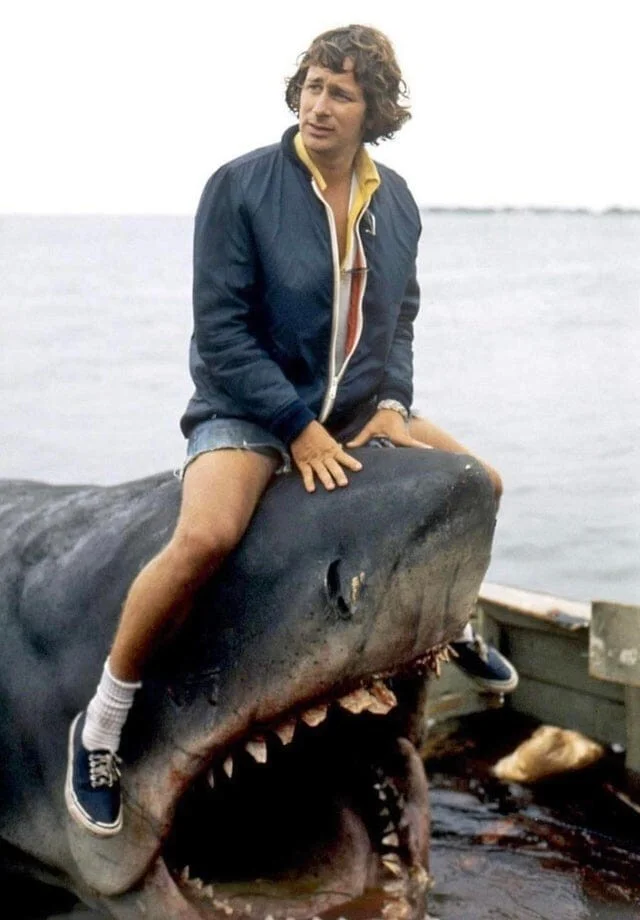 Director Steven Spielberg on a mechanical shark during the filming of Jaws, 1974